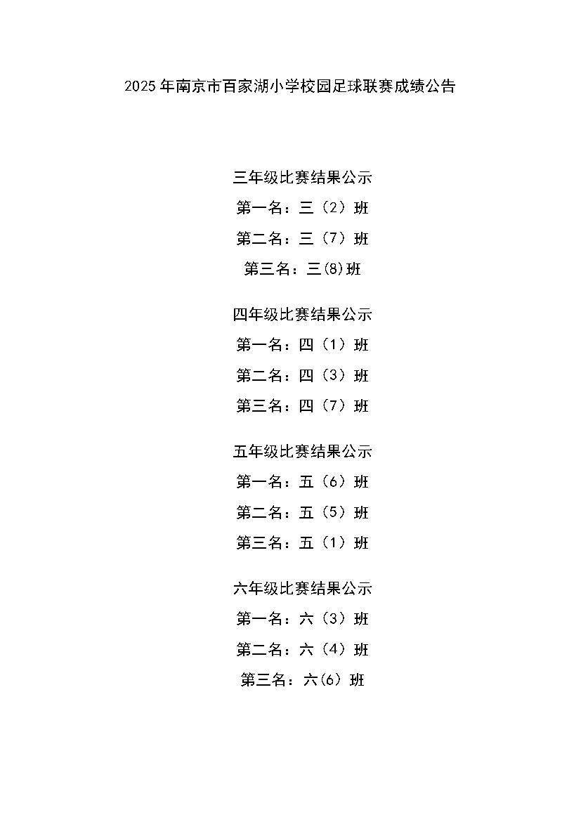 2025年南京市百家湖小学校园足球联赛成绩公告