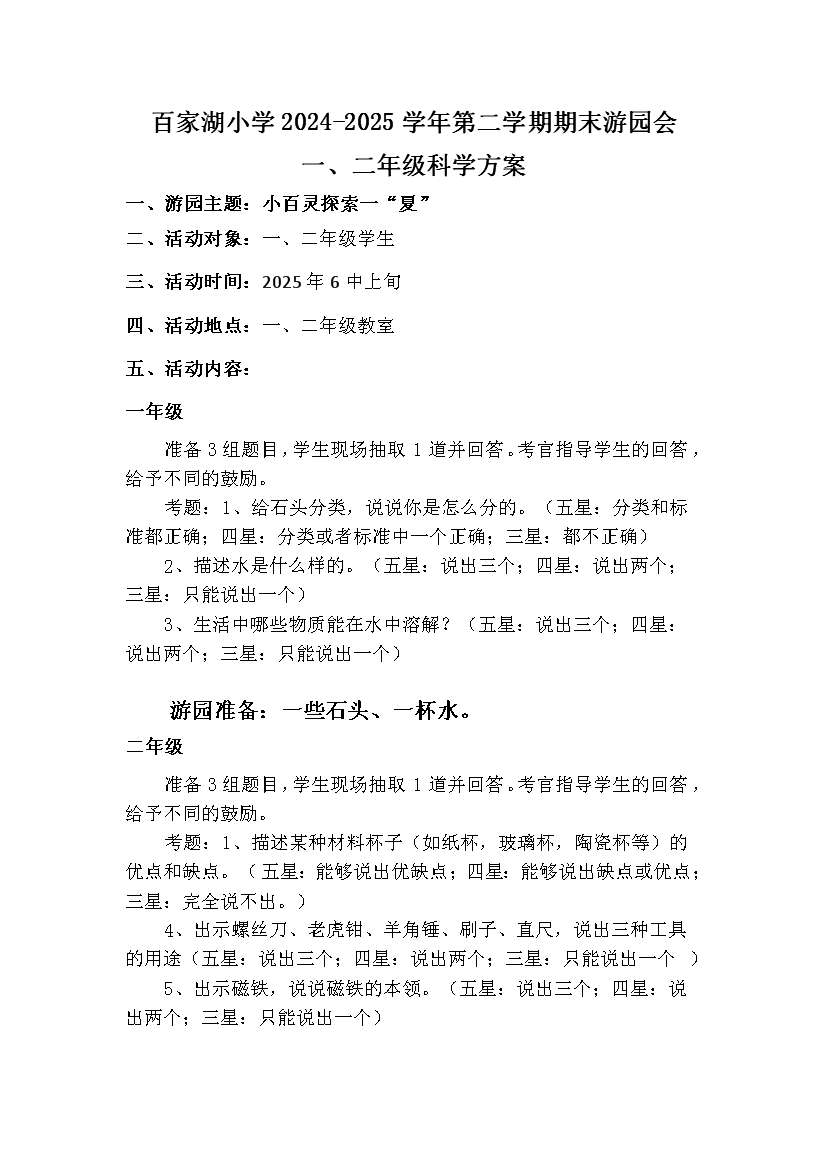 :南京市百家湖小学2024-2025第二学期科学学科期末学业素养水平测评方案