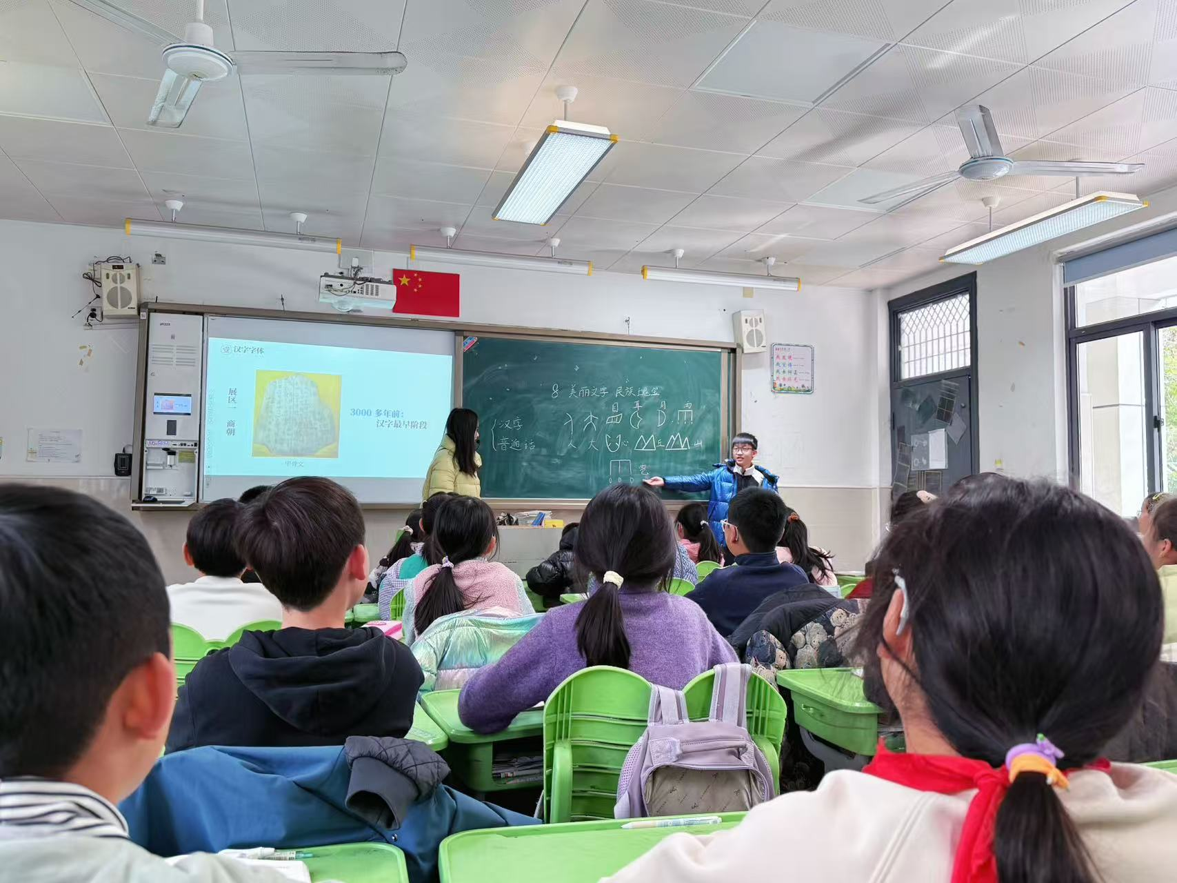 刘雅姝老师在五(2)班呈现了充满文化韵味的课程。课堂以探索“神秘文化包裹”开启,引发学生对文字奥秘的好奇。刘老师引导学生联系生活,分享所见多样文字,进而理解推广国家通用语言文字的重要意义。